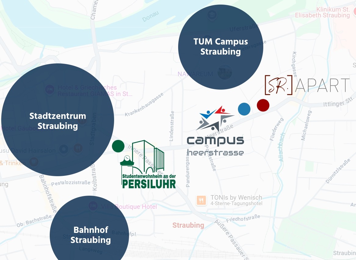 Alle Wohnheime liegen fußläufig optimal zwischen TUM-Campus und Straubinger Innenstadt.